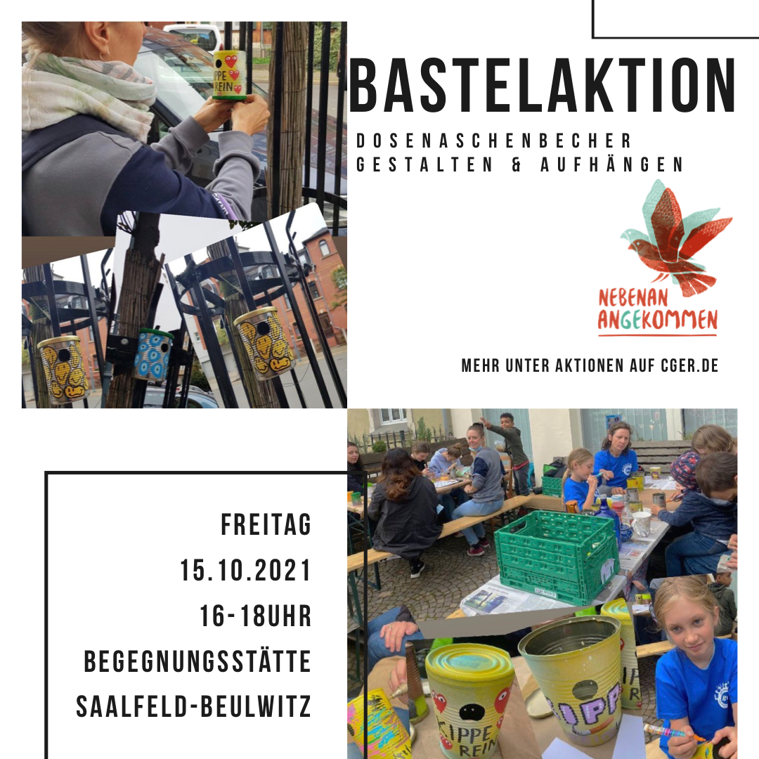 Im Oktober 2021 fand in der Begegnungsstätte Saalfeld-Beulwitz eine der ersten Bastelaktionen rund um die späteren Kippenfresser-Dosenascher statt. Gemeinsam mit Interessierten & Anwohner:innen aus dem Stadtteil wurden alte Konservendosen kreativ bemalt und neu gestaltet.