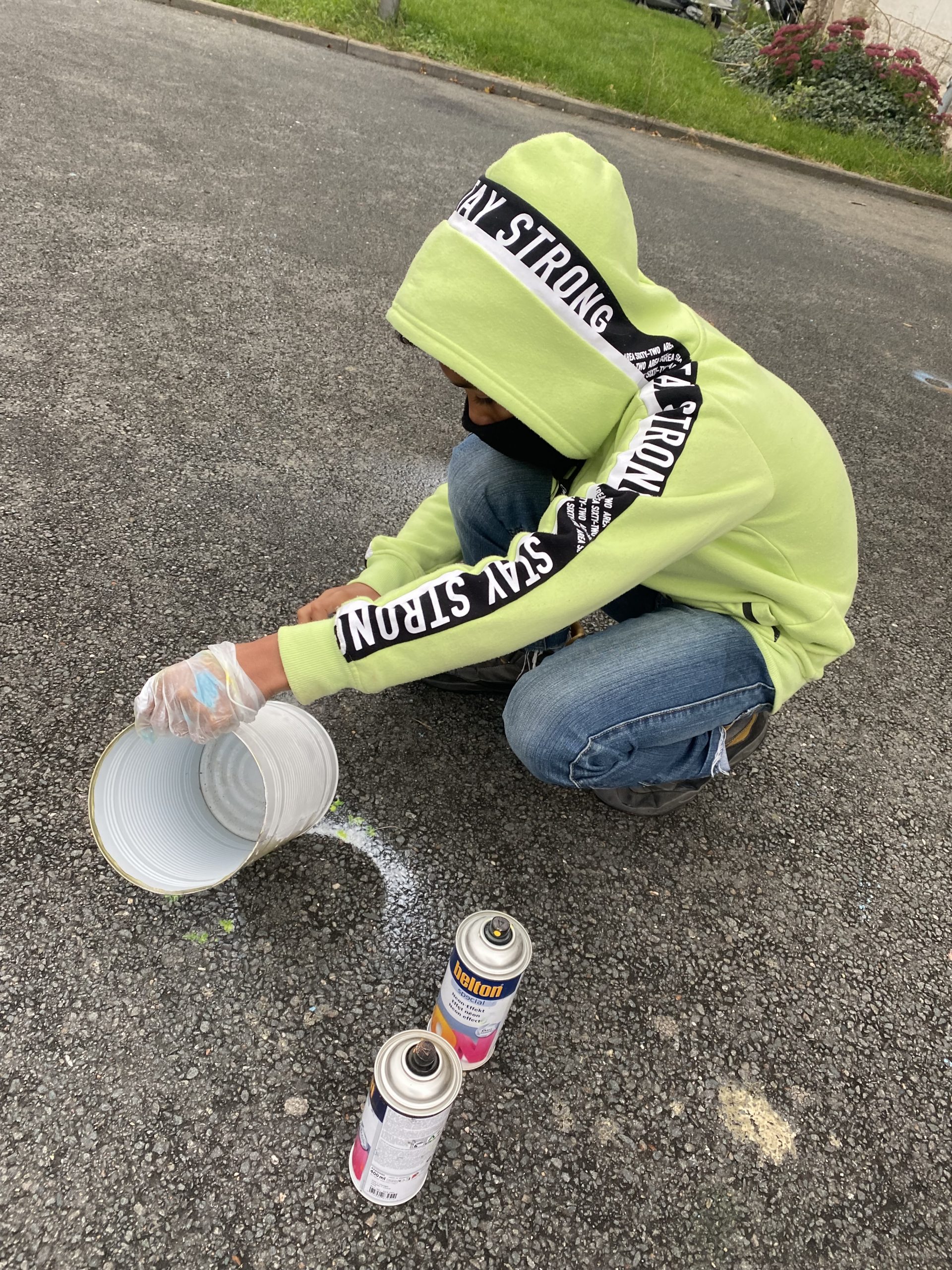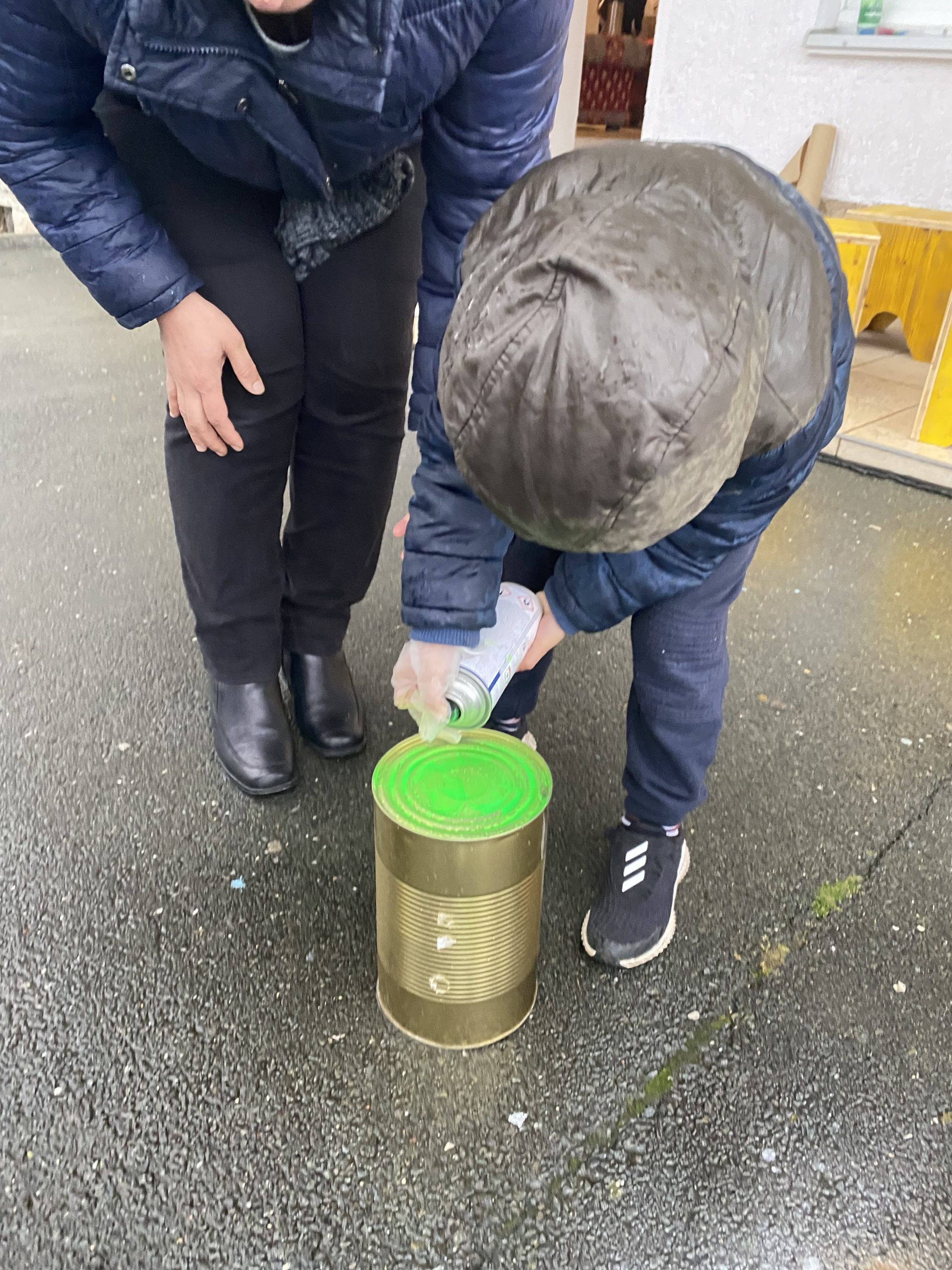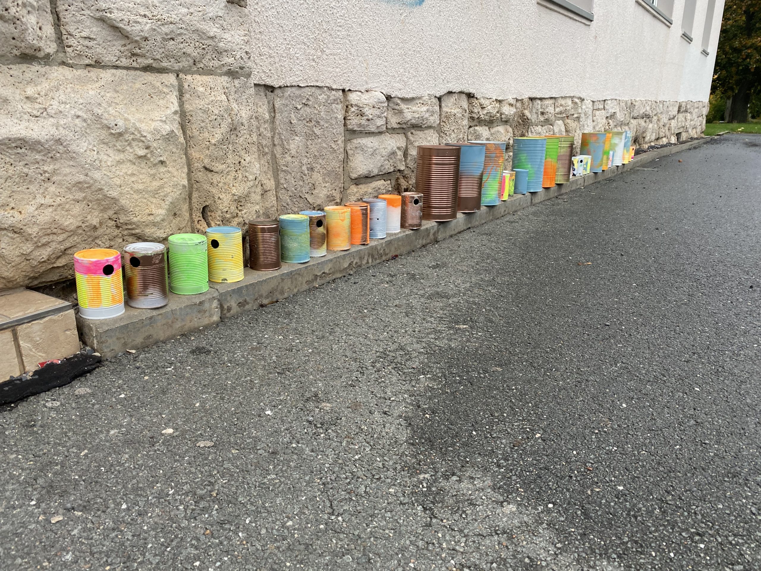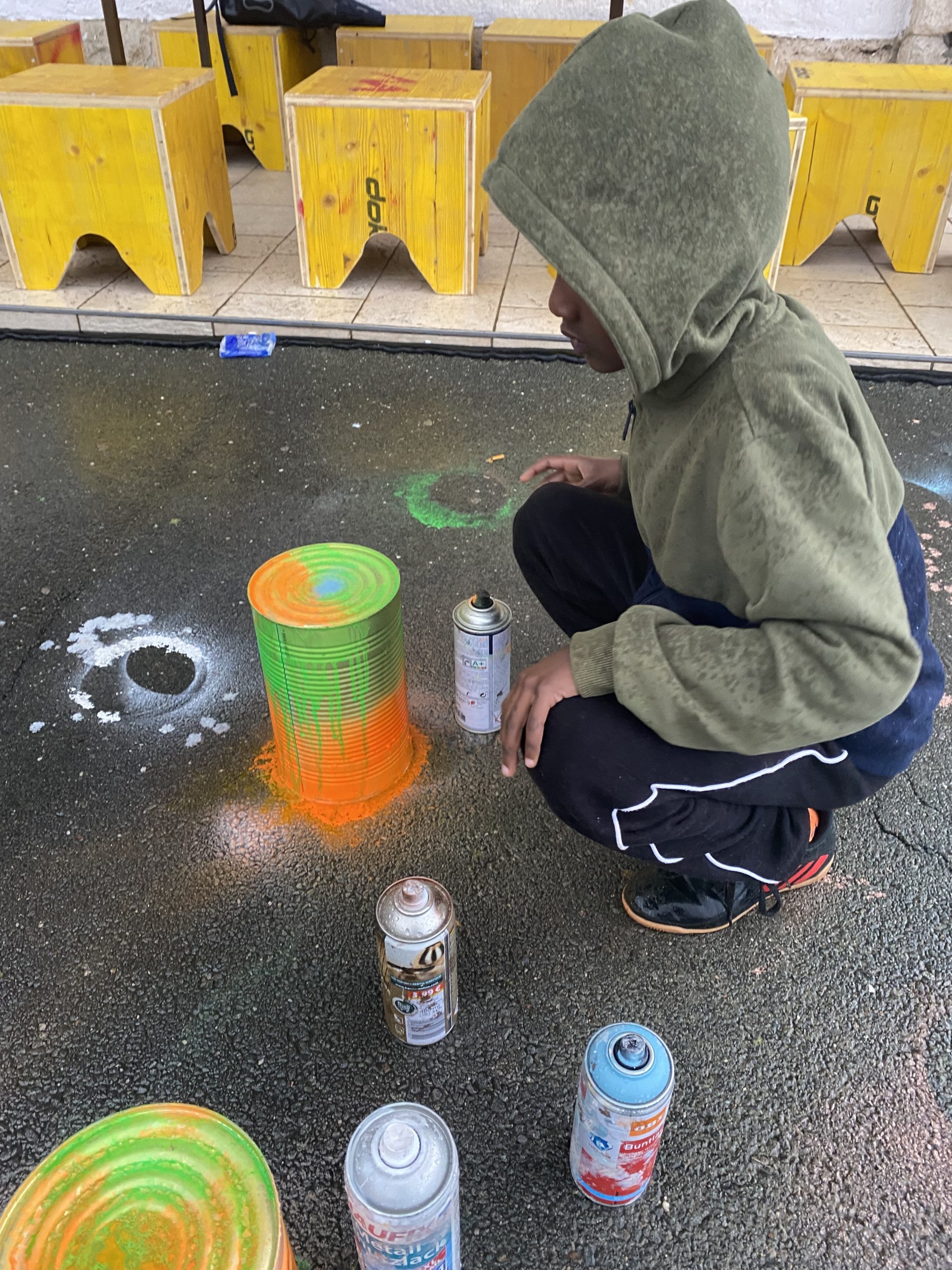 Die größeren 5-Liter-Dosen wurden besprüht und kreativ gestaltet. Viele der bunten Behälter durften anschließend als kleine Abfalleimer oder Sammeldosen mit nach Hause genommen werden – zum Beispiel fürs Kinderzimmer oder Büro.