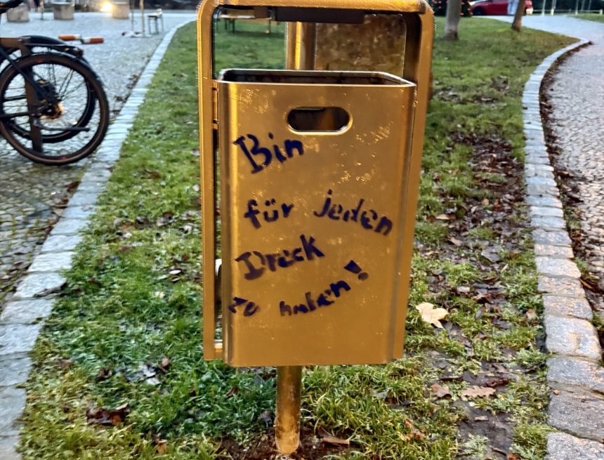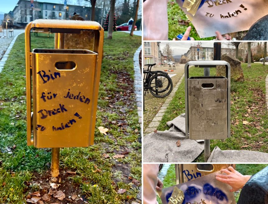 Auch ein Mülleimer bekam ein Upgrade: vergoldet und versehen mit dem Spruch „Bin für jeden Dreck zu haben.“ (Credits an die Sabel Schule Saalfeld für die Schablone)