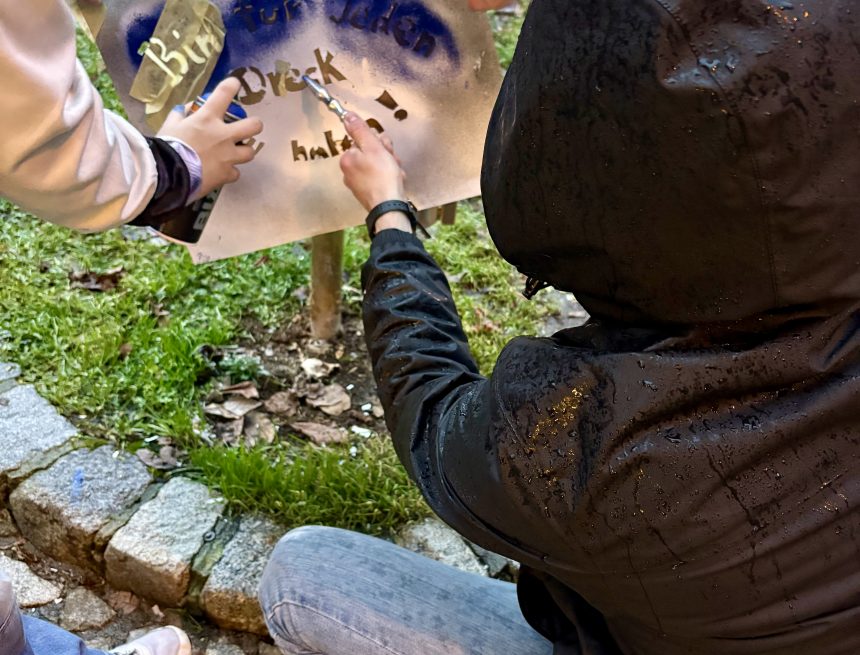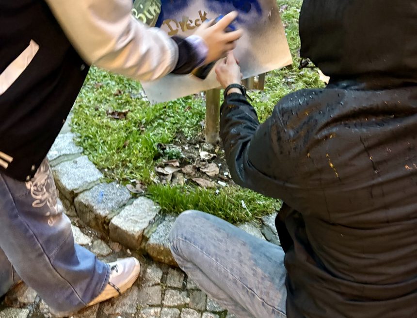 Trotz Regen und Kälte haben die Kids beim ersten Tag der Kippenfresser Popup Days richtig angepackt. Neben bunten, kreativen Designs für die **Upcycling-Aschenbecher („Kippenfresser“) ** wurde auch der kleine Park vor dem Klubhaus Saalfeld von Zigarettenkippen befreit – rund 500 Kippen kamen dabei zusammen.